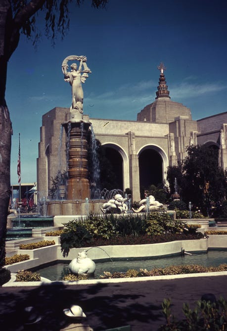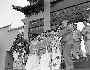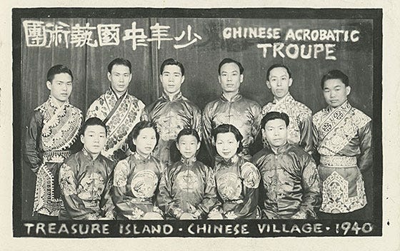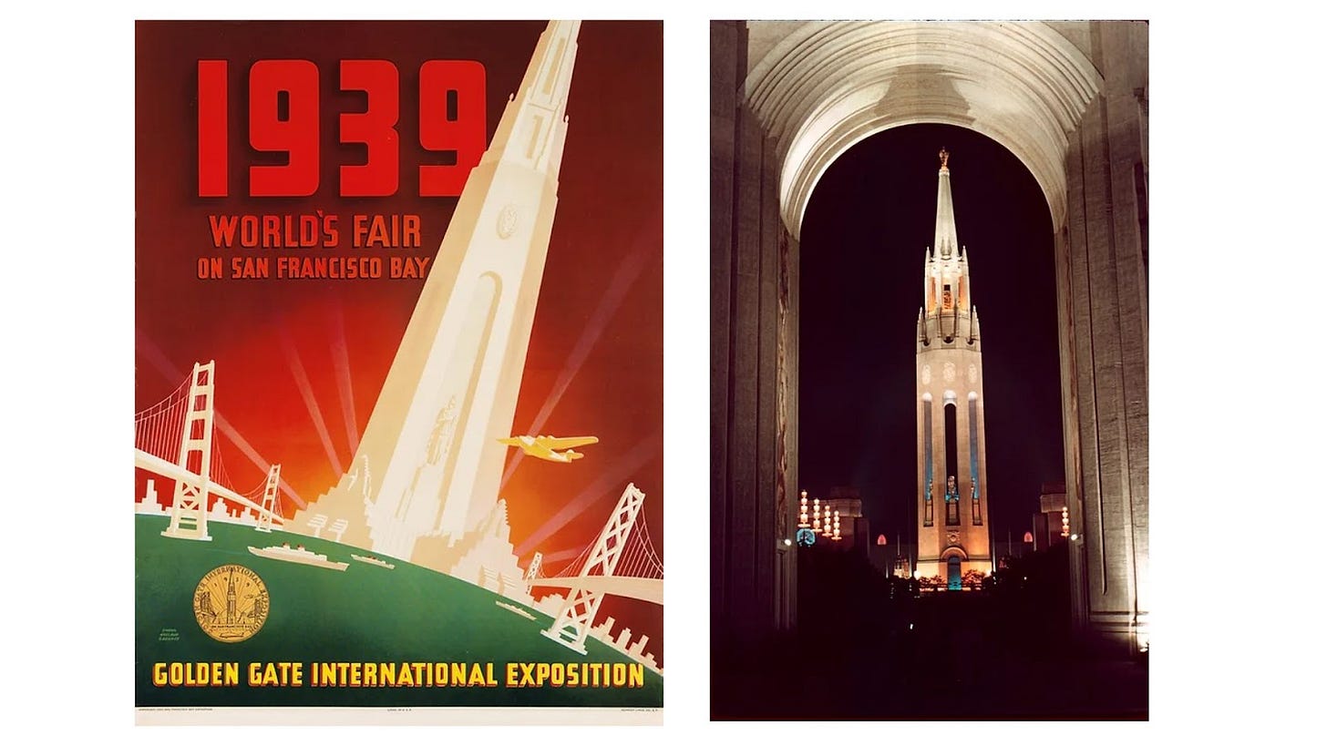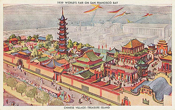 海湾大桥Bay Brigde 在 1936年通车,金门博览会 在1939年开幕,因为旧金山夏天的天气凉爽宜人,在1939到1940年的两年中,有多达1700万游客到小岛游览。主办方邀请了太平洋地区的22个国家参加,但随着二次大战的爆发许多国家在参展期间撤出,彼时的少年中国(中华民国)也深陷抗日战争和内战泥潭中,无暇官方派出筹备组,图中的中国展馆是由旧金山的华人移民为主的华侨社区集民间资建的中国村,其占地面积属各国场馆中最大,文化展览表演种类很是丰富,不由得感叹早期华人移民社区之强大。