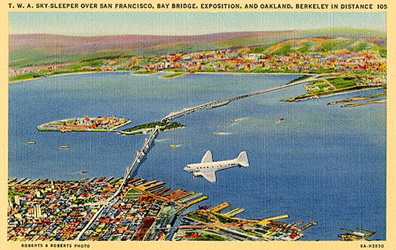 那个时候的旧金山机场SFO已经建立,但人们觉得他离城市太远,所以开始在岛上建一系列机场相关的建筑:机库和航站楼。当时的泛美航空的航站楼正是现在小岛的1号楼,也是小岛后来的行政中心和现在的出租办公室和历史博物馆。彼时的人们正努力调动各方面的资源把金银岛规划成一个可以代替SFO的机场。1939-1945年泛美航空的豪华客运跨太平洋的航线,让金银岛最小程度的实现了这一规划,使1号航站楼成为了旧金山的第一个国际机场。不过和画饼图中的方案不同,他们的起降落地点是在薄荷岛和金银岛背对洋流的海湾水面上: