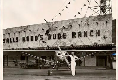这位裸舞牧场的老板Sally Rand 是一个传奇人物,不仅在各地博览会开舞社表演赚钱,还是著名扇子舞的发明人,同时她还是一个很有经验的飞行员。照片中的她和她的飞机站在她在金银岛金门世界博览会的裸体舞社门口,和自己刚买的飞机合影。作为届时非常成功的大明星她需要到处旅行表演,而她最喜欢出行的方式,就是自己开飞机。她曾经从旧金山独自开飞机到Reno,一路飞得太快还打破了飞行速度记录。由于她高调的行事风格和一再的突破保守价值,在她的一生多次被告或是被捕,最终都得以脱身。(笔者或许会为她专门写一篇文章)