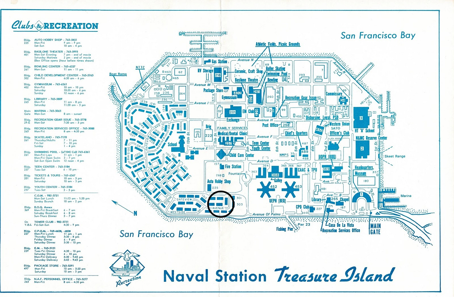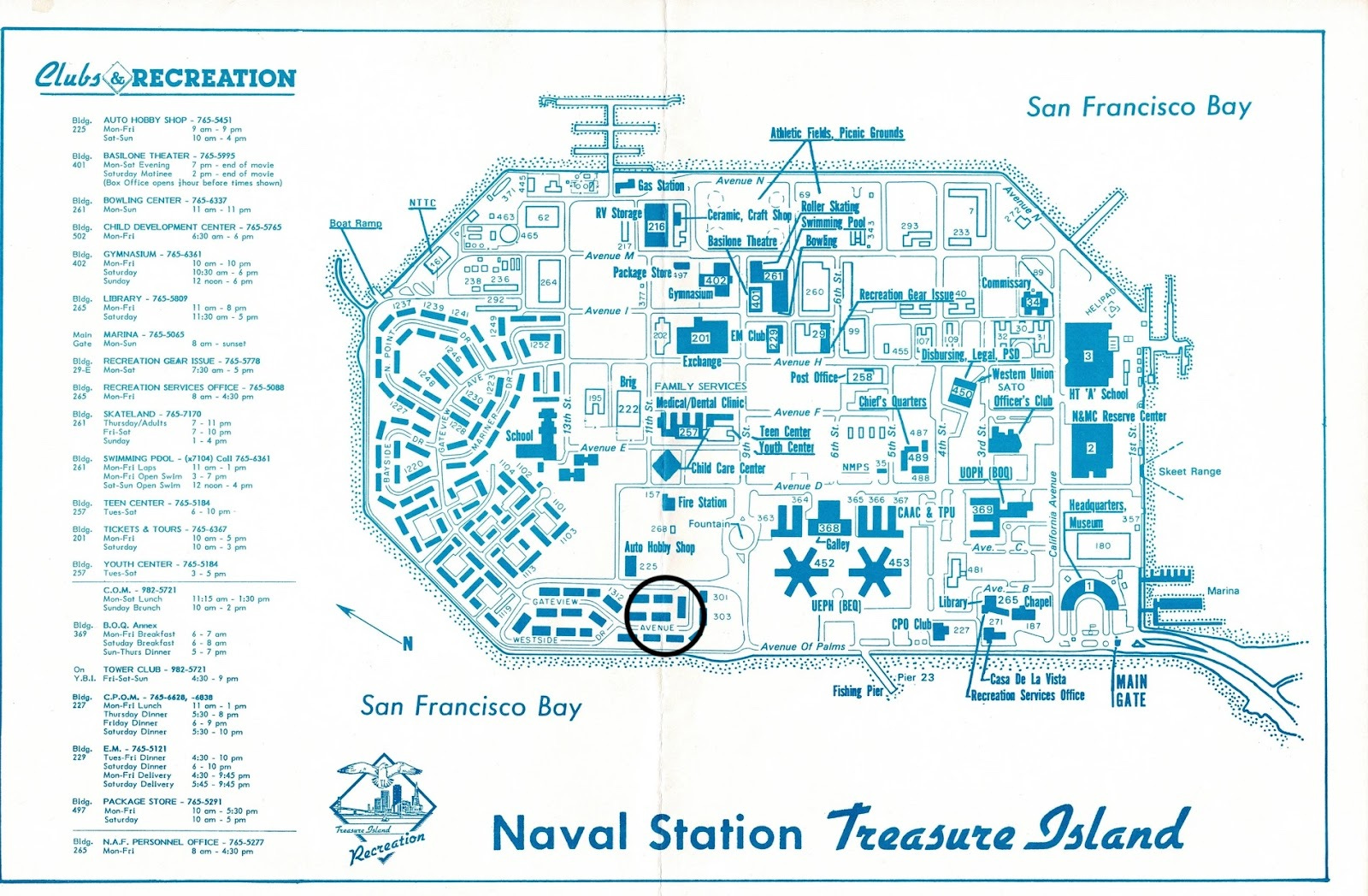 海军把金门博览会的很多场馆都用来做军事设施,大的展厅被改造成集体食堂,宿舍,游泳池和剧院。当时的小岛逐渐变成了一个功能齐全的小镇,邮局,百货商店,教堂和加油站一应具全。生活设施也一样:有多家餐厅,理发店,裁缝铺和俱乐部等等。海军官方的称谓叫作:金银岛海军基地 Naval Station Treasure Island(NSTI)
