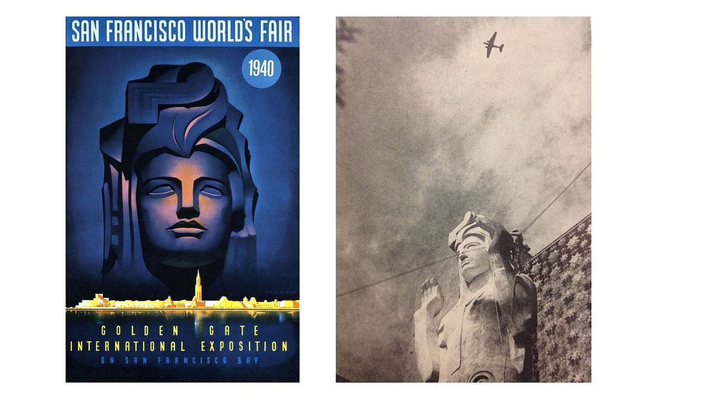 彼时的旧金山,伴随着金银岛的建成和金门博览会的召开被冠以太平洋大都会的称号,主办方为了塑造出拥抱亚太,包容多元的新新理念,虚构出了一个太平洋女神形象,并把她作为金门博览会和金银岛的象征放入宣传册,太平洋女神的塑像一度是金银岛上的有名打卡点。多年后这个雕像已经被军方拆毁,一位老人为了重建自己童年中美好的太平洋女神雕像,在2009年成立了一个非政府组织筹款重建雕像 Pacifica II Statue Project, 然而似乎这个筹款项目进展的不顺利,脸书主页也在2013年后停止更新。