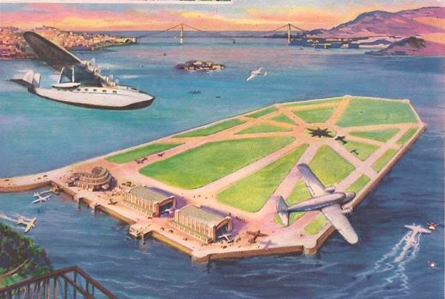 罗斯福当初愿意动用联邦资金修造金银岛时,规划者还把金门博览会后的金银岛变成一个可以替代SFO的新机场作为后期计划。我找到了画饼时的方案图: