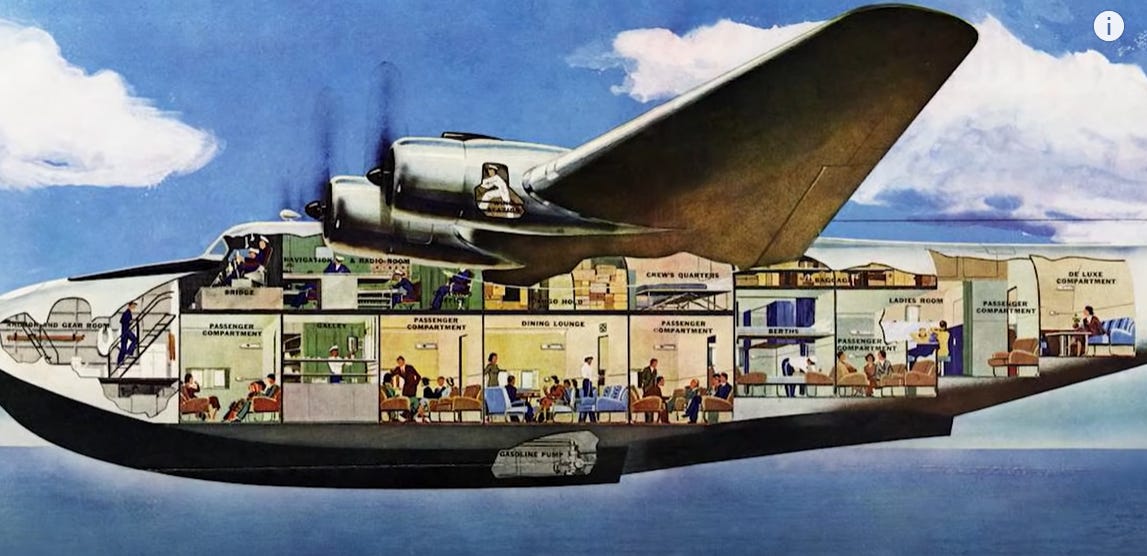 波音314 Clipper fly boat 的内部结构, 可以承载74名乘客在空中舒适旅行,每个人都有自己的包厢,还可以走到餐厅用餐,甚至有一间豪华蜜月套房
